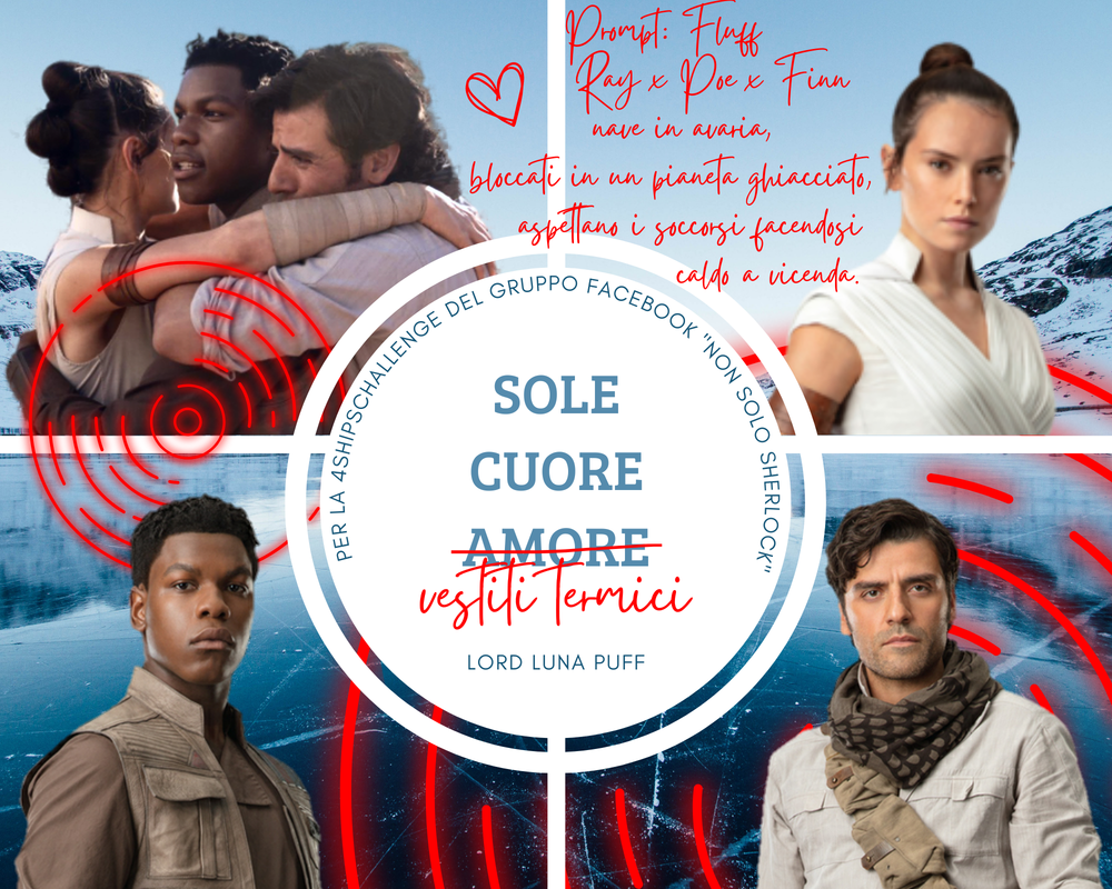 –Finn a ragione, dobbiamo mantenere il calore corporeo– gli diede manforte la jedi –dobbiamo trovare un punto centrale dell’astronave vicino ad una fonte di calore ancora attiva e aspettare lì. Ben venga abbracciarci, ma non spogliarci. Anzi, dovremmo indossare il più possibile.